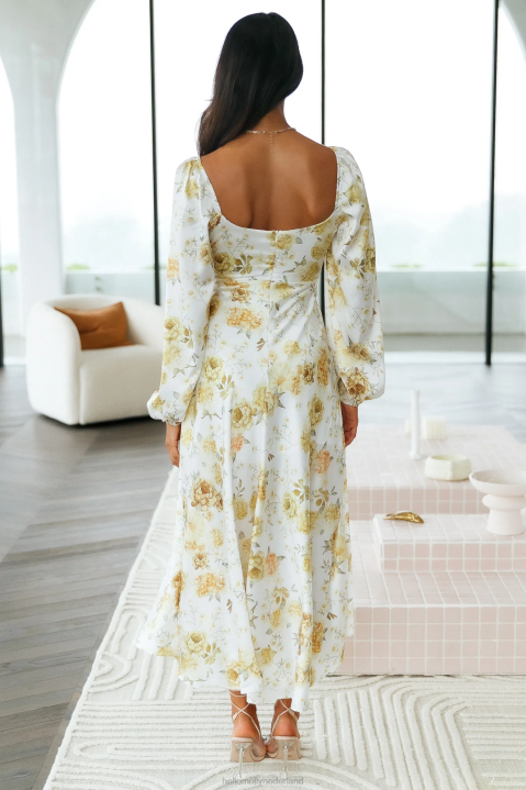 wissel de liefste daglichtwoorden uit met deze kenmerkende maxi. Breng zonnige tijden naar nieuwe lengtes met dit exemplaar met een hartvormige halslijn, uitgesneden details aan de voorkant, lange pofmouwen en een prachtige lange rok.