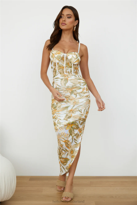 Trek de aandacht in de dessert queen maxi-jurk. met doorschijnende panelen in korsetstijl, bloemenprint en een zijsplit. style dit exemplaar met ruches met hakken en gouden sieraden.
