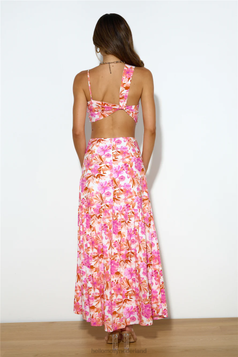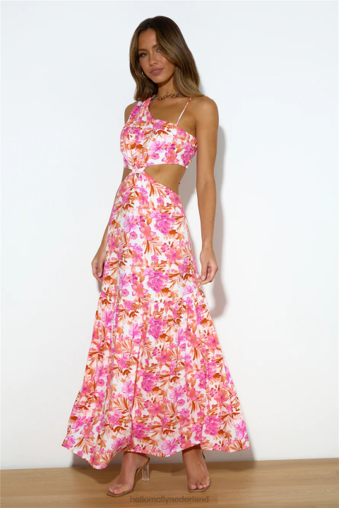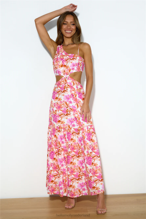 zie er prachtig uit in de maxi-jurk met print. met een uitsparing en een zwierige rok. stijl met hakken en krullen om indruk te maken.