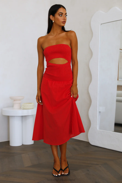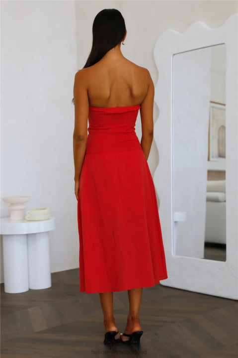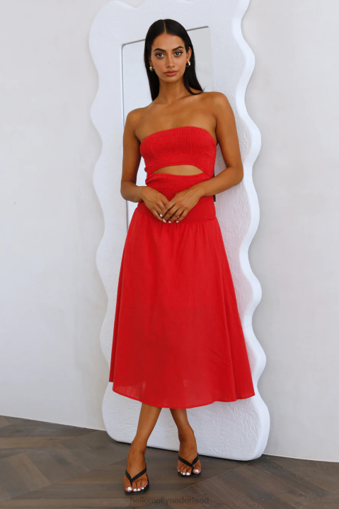 begeef je op een karmozijnrode horizon met deze boho-chique droom. voorzien van een strapless ontwerp met een uitsnijding aan de voorkant en een uitlopende rok. style de jouwe met muiltjes en golven.