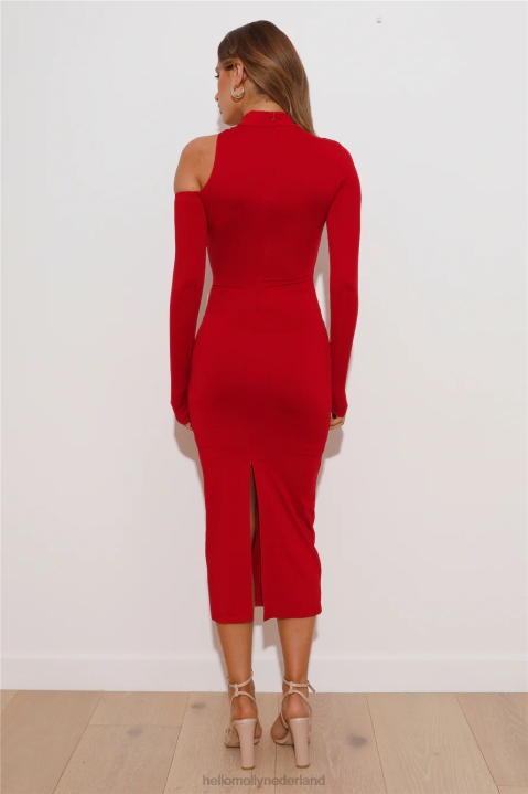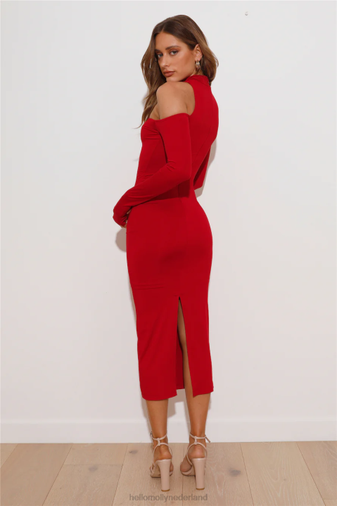 Laten we ons flirterig en leuk voelen, meid. de late maar modieuze midi-jurk heeft een uitsparing en lange mouwen. stijl met hakken en krullen voor een look die we de hele zomer dragen.