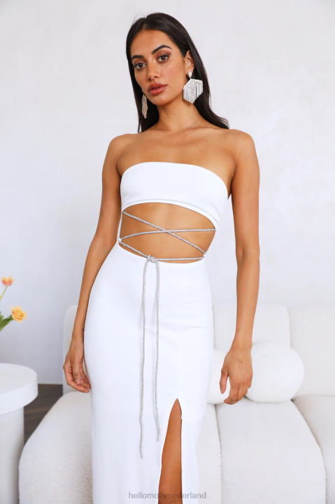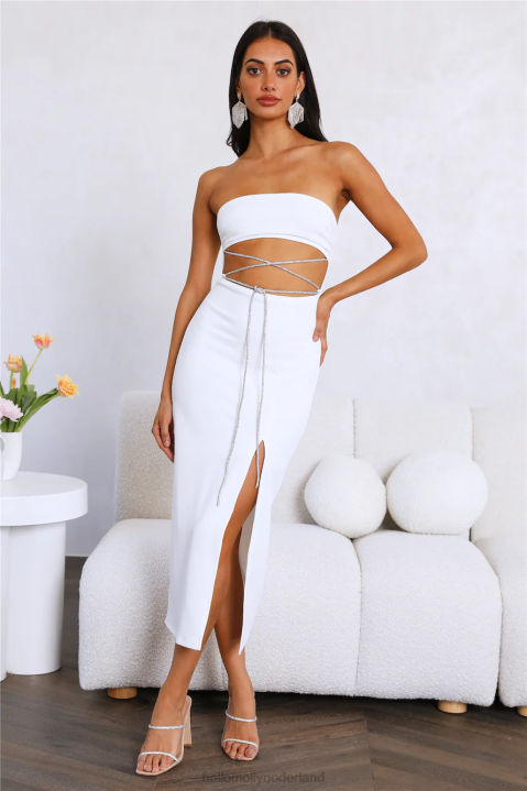 haal de limousine en je beste champagne tevoorschijn, het is tijd om groots te leven! Laat de alledaagse look achterwege en kies voor deze midi die is gemaakt om je favoriete items te laten schitteren! met een strapless halslijn + baleinen, een uitsnede in het middenrif met een met diamanten ingelegd crossover-detail dat aan de achterkant kan worden gestrikt, en een zijsplit. style de jouwe met hakken en golven.