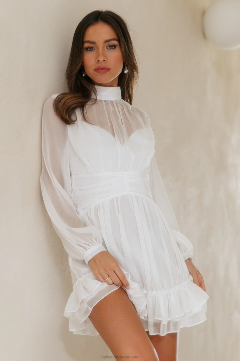 Tijd om op te vallen en tegelijkertijd schattig te zijn! De Blossoming Words-jurk heeft een hoge halslijn met lange doorzichtige mouwen, een open rug en een uitlopende rok. style de jouwe met muiltjes en golven.