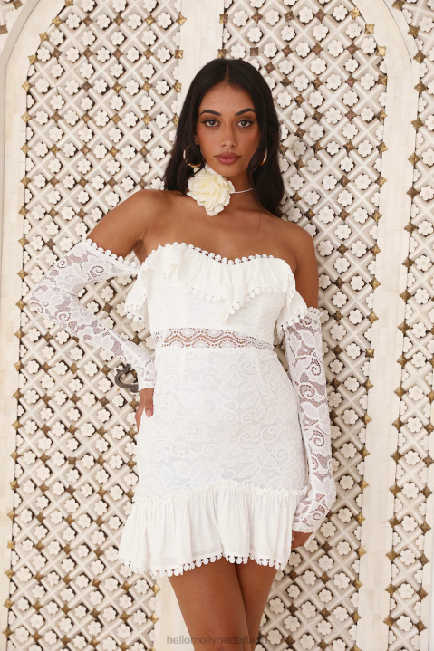 Wij zijn dol op de mini-jurken van dit seizoen. De mini-jurk met 'first place'-look heeft kanten details en een ruches aan de zoom. stijl met hakken voor een look waar we geobsedeerd door zijn.