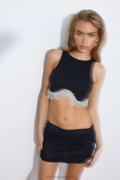 Je outfit wordt gesorteerd in de kleine glinsterende crop-top. met diamanten afwerking en rekbare geribde stof. stijl met jeans en hakken.