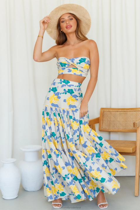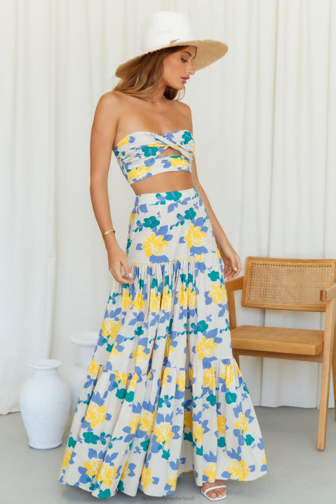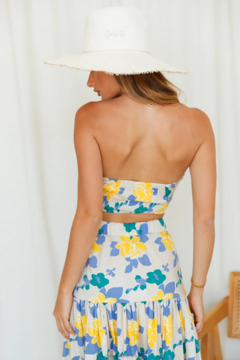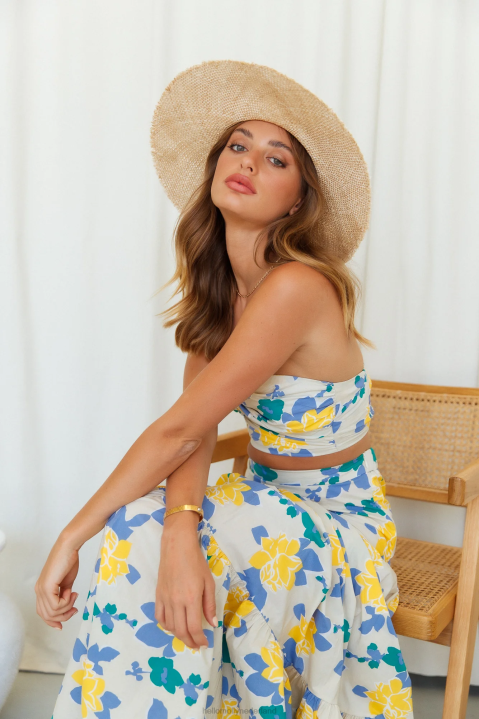 wees de schattigste met deze prachtige strapless crop top. Met een draai aan de buste en een uitsnijding eronder, is dit een echte must-have. combineer dit met de bijpassende maxi- en blokhakken.