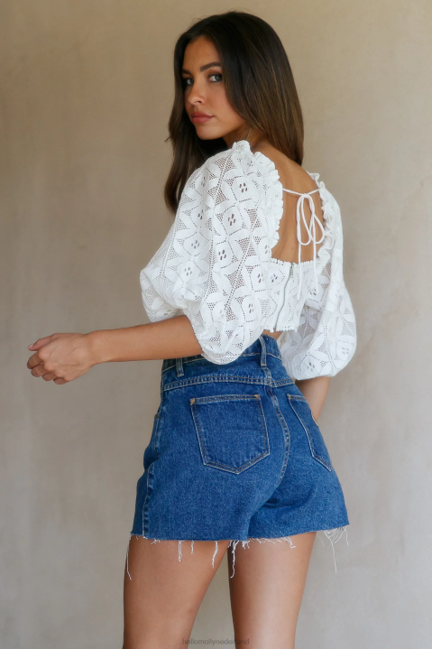 Wat is er zo leuk aan om altijd de serieuze te zijn, los te laten en te verdwalen in het doolhof met dit statement-gewas. met een off-shoulder ontwerp met korte pofmouwen en een gehaakt detail. combineer hem met een schattige minirok en muiltjes.